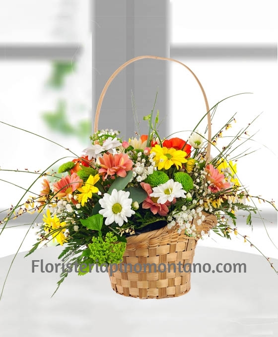 A una Cesta de Flores, se le puede adjuntar algún complemento de los que ponemos a disposición de nuestros clientes en Floristería Pino Montano. Puede ser; cerámica, jarrón, peluche, bombones…