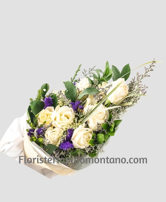 Bonito y fino Ramo Funerario 8 Rosas Blancas para entregar en los Tanatorios. Es un ramo funerario de flores variadas, en tonos blancos, confeccionado con rosas, limoniun azul y verdes variados que le dan al ramo de defunción un toque dulce y delicado. Este ramo de flores para funeral es un producto de gran calidad, con flores para difuntos frescas suministradas a diario por nuestros proveedores, tanto nacionales como internacionales. Por lo que lo elaboraremos lo más parecido posible o a gusto del cliente. Nuestros trabajos de flores para funeral, están siempre realizados con flores para difuntos y verdes variados, Son ramos para funeral efectuados de forma totalmente artesanal por nosotros. Somos floristas profesionales, por lo que su ramo quedará bonito y elegante. Además, ofrecemos un servicio de envíos urgentes de flores para tanatorio.