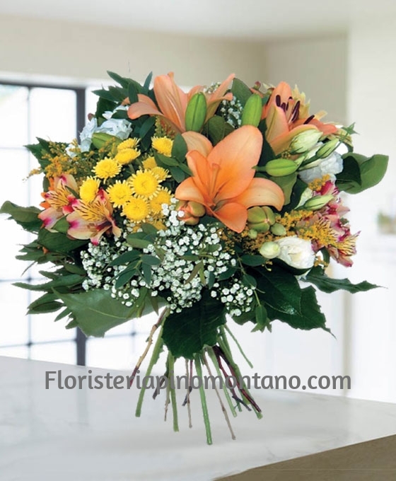De entre nuestro ramos de flores de temporada, el Ramo Flores Lisboa, realizado en tonos alegres pero que nos reflejan los dulces colores del otoño, aporta un aire romántico y otoñal muy especial. Compuesto por flores silvestres como las margaritas, paniculata, alstroemerias, lisianthums, y también por flores más especiales como es el lilium, realizado con colores otoñales y decorado con bonitos verdes que le dan ese aire tan alegre y bonito, que nos aboca al otoño, que es sin duda una estación de colores especiales. Es el ramo de regalo perfecto, que sin duda podemos hacer si lo que queremos es alegrar un día especial. Bonito ramo de flores de regalo que presenta nuestra floristería.